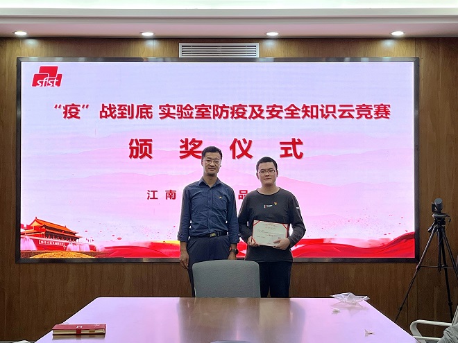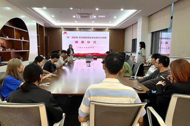 主办的“疫”战到底—实验室防疫及安全知识云竞赛活动圆满结束。活动共评选出一等奖1名,二等奖3名,三等奖5名和优秀奖5名。颁奖仪式上,学院实验室主任王文龙、党委专职组织员王胤、研究生辅导员胡卉君、谷物与淀粉工程研究中心博士党支部书记尤钰娴分别为获奖学生颁发证书及奖品,并再次强调了疫情常态化防控形势下,实验室安全教育的重要意义。