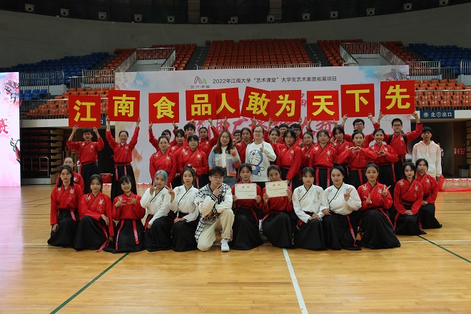 的选手们入场井然有序,动作整齐划一,或长袖飘飖、裙袂生风;或蛾眉轻敛、素手成拳,食品学子在比赛中精神饱满、动作整齐划一,赢得了在场观众的阵阵掌声。表演最后,我院参赛选手打出“江南食品人,敢为先下先”的标语,展现出食品学子朝气蓬勃的青春风采。