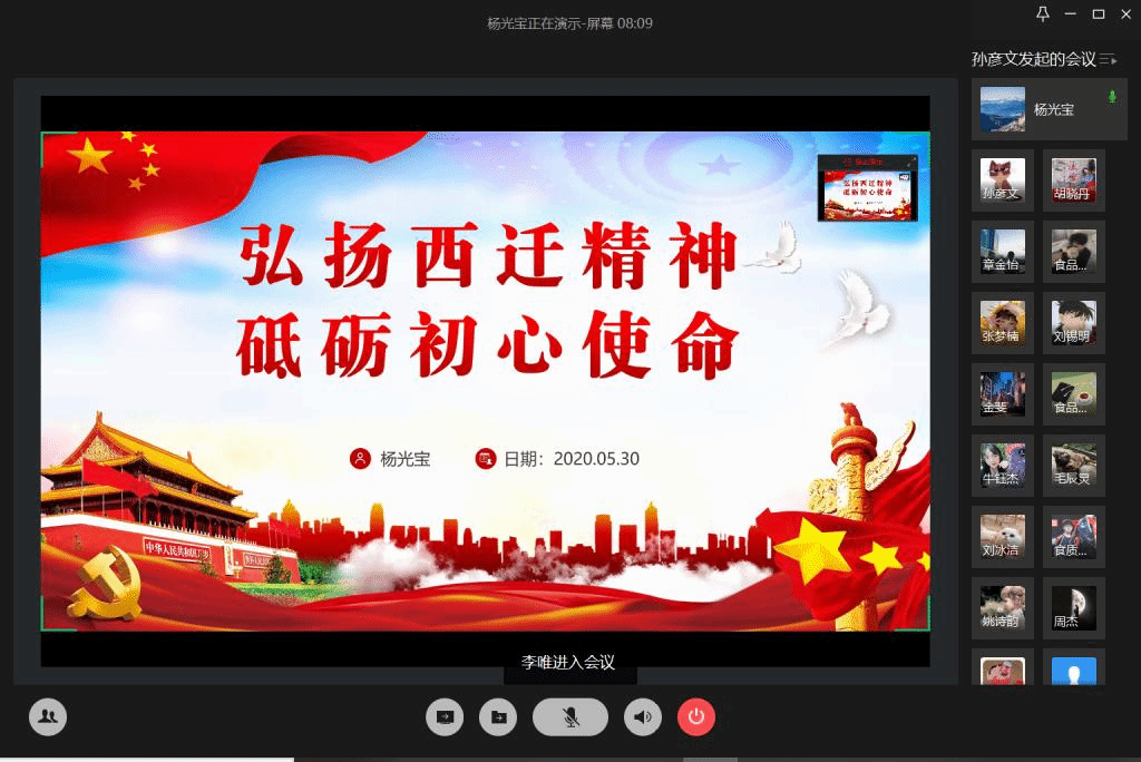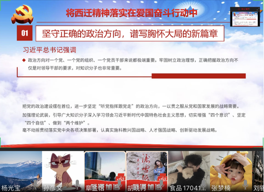 本科生第一党支部通过企业微信举行“弘扬西迁精神,砥砺初心使命”专题党课。党课活动由支部书记胡晓丹主持,支部组织委员杨光宝主讲。此次党课还邀请了食品营养与功能食品工程技术研究中心博士党支部、食硕1907党支部、色情网站