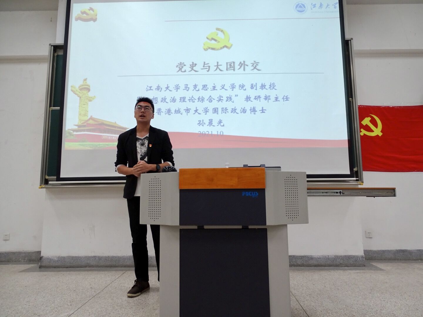 随后,孙晨光老师给新生党员讲授了第一节党课——《党史和大国外交》。他围绕加强应对疫情之策、中国外交发展简史、中国重返联合国50周年纪念活动三个方面进行了阐述,带领同学们回顾了中国的外交历程。他呼吁大家理智面对疫情,相信国家、相信党的领导。