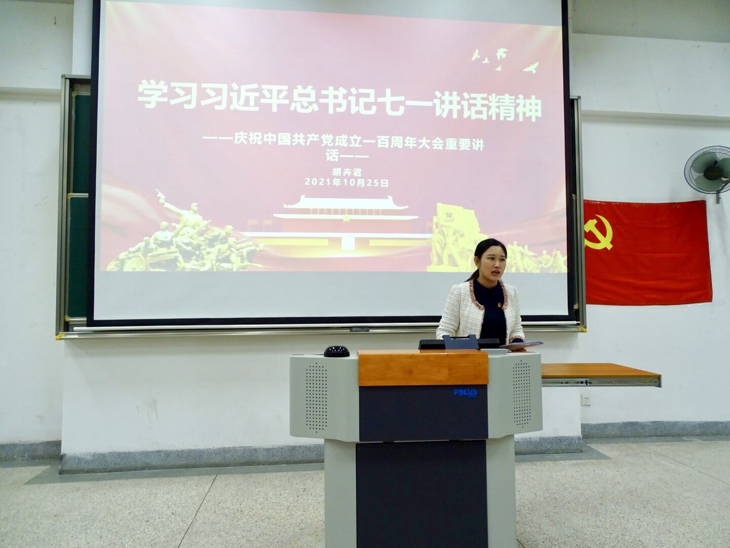 胡卉君领学了习近平总书记在庆祝中国共产党成立100周年大会上重要讲话。她强调,党员同志应始终牢记党员责任与义务,定期参加组织生活,有效发挥党员先锋模范作用,实现党建与科研双促进双提升。
