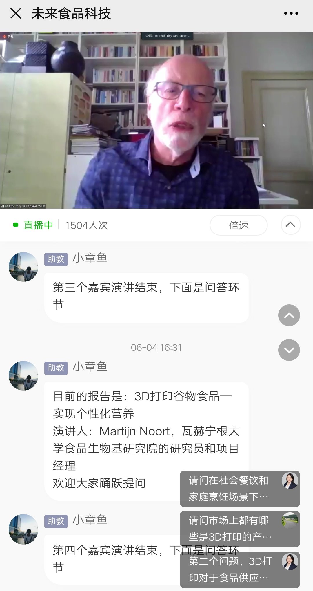 -瓦赫宁根大学及研究中心未来食品云端系列论坛”第二期期会议隆重举行并取得圆满成功。在首期论坛的基础上,本期论坛的筹备总结了前期工作的经验与不足,优化了流程,成功吸引了来自国内外1700多名专家、学者和同行等的积极参与。本次会议仍然采用网络直播的形式举行,围绕“食品3D打印”这一国际前沿性话题展开研讨。出席本次会议的嘉宾主要有荷兰瓦赫宁根大学及研究中心Maarten Schutyser教授、Martijn Noort研究员以及浙江大学贺永教授和色情网站