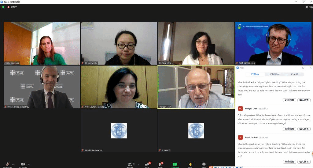 本次研讨会共有46位国际参会者,现场反响热烈,展现出大家对食品科学与技术领域线上教学的高度关注。研讨会后半段,观众与嘉宾进行了问答环节,通过与几位专家的讨论,明晰了线上资源对于学生学习热情的影响,肯定了在线教学在疫情环境下扮演的重要角色。本次网络研讨会的成功举办,为广大食品科学与技术领域教育工作者搭建了沟通、交流的平台,为大家在疫情之下教学工作的开展提供了更多方法思路、以及更多原创性的研究。