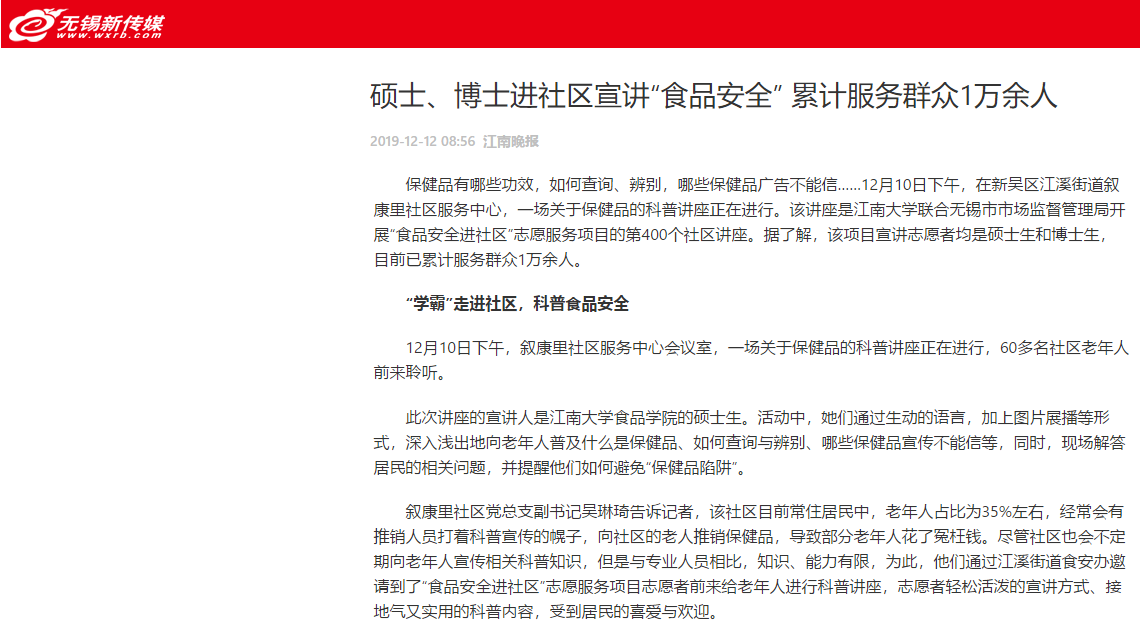 12月12日,江南晚报以《硕士、博士进社区宣讲“食品安全”累计服务群众1万余人》为题,对该项目的具体开展情况和引起的社会反响进行了报道。文中介绍,该项目自2012年创立以来,来自色情网站