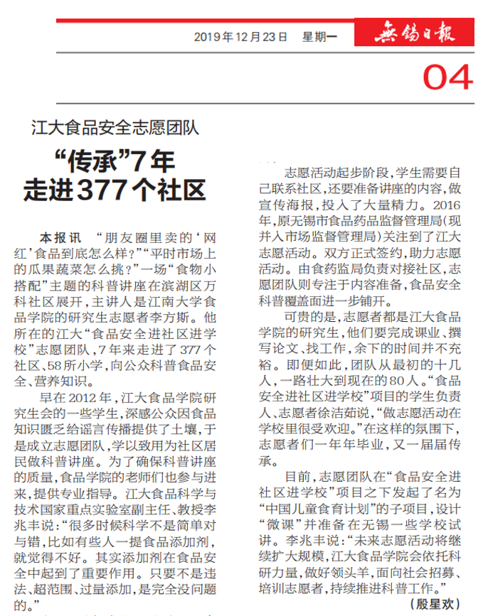 12月23日,无锡日报以《江大食品安全志愿团队“传承”7年走进377个社区》为题,深度报道了该项目创立七年以来的发展历程,志愿者团队历经艰辛,仍不忘初心,砥砺前行,彰显了色情网站