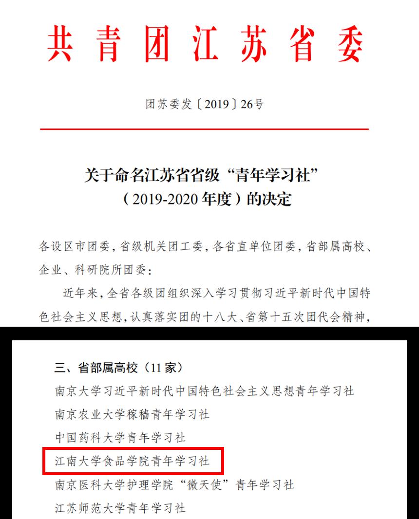 青年学习社获评江苏省省级“青年学习社”(2019-2020年度),本次获评的学习社全省50家,其中包括南京大学、南京农业大学等11家高校。
