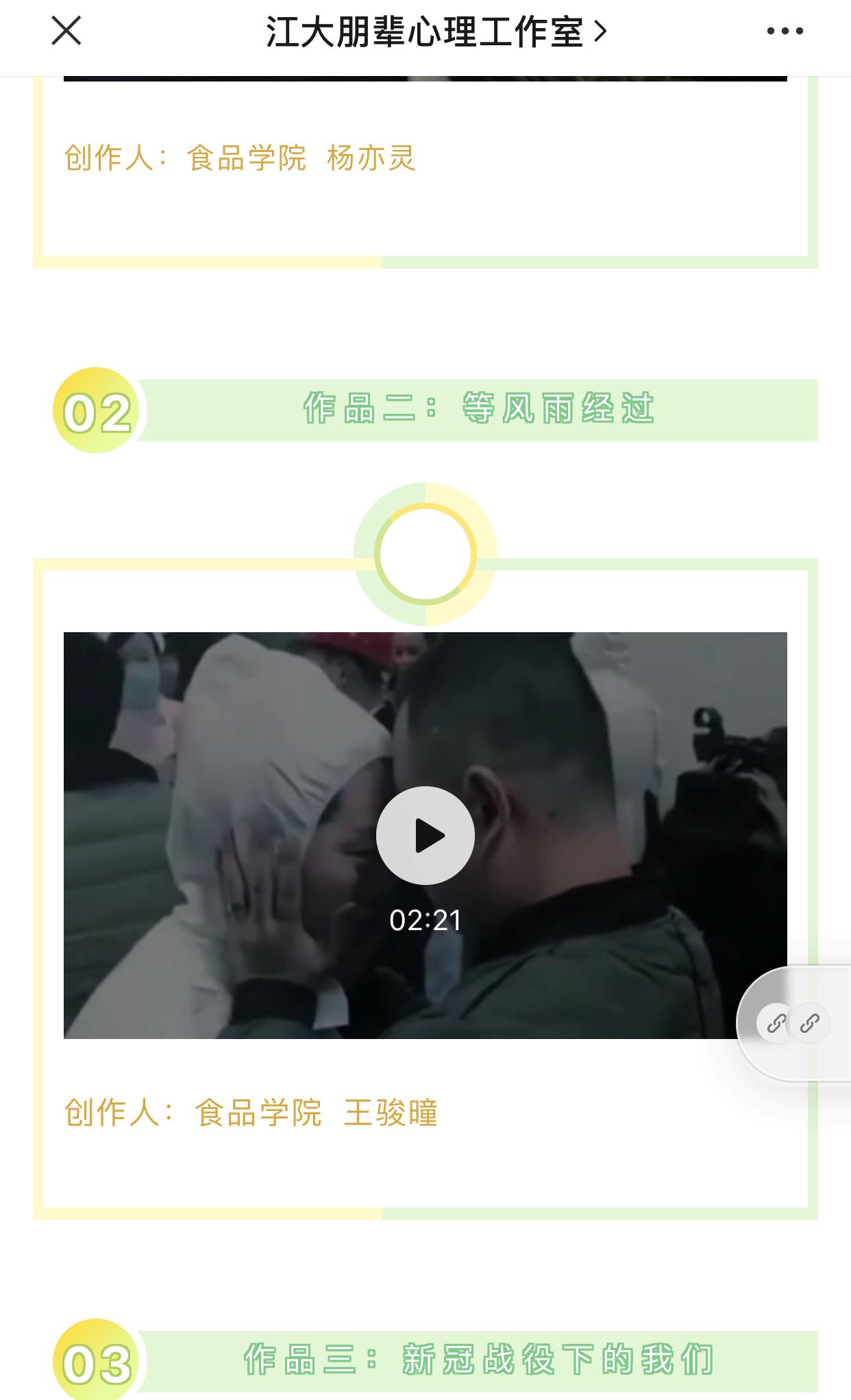 各班同学积极参赛,踊跃投稿,其中食质1902班吴洁茹、食科1902班黄家祺、食科1903班包维佳、食科1908班李亚茹同学向我们展示了在疫情中挺身而出、冲锋在前的新时代青年形象,食科1907班陈昕玥同学的视频体现了中华民族的强大凝聚力与乐观不屈的精神,食科1903班杨亦灵、食科1903班张雪怡、食科1906班刘芷阁、食科1908班丁玉婕同学让我们看到具有使命担当的个人与具有大国担当的国家,食质1801班夏中瀚同学则让我们感受到了同心同德共克时艰的信心。最终学院从19项投稿作品中选择10项优秀作品,报送给学校心理健康教育中心择优展示。