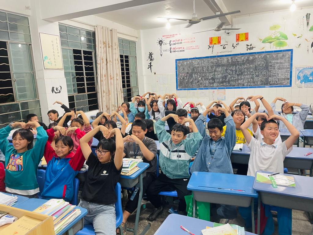 芒宽民族中学的同学们主动给志愿者“比心”