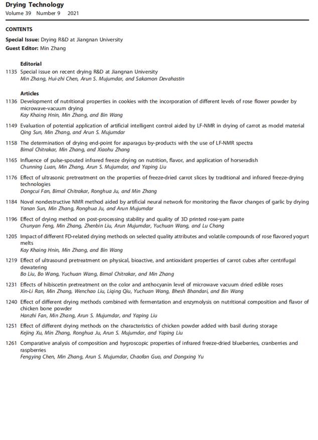干燥研发(Drying R&D at Jiangnan University)”为主题,表彰该团队近年来对食品干燥技术的研发、产业化以及国际干燥领域交流等方面作出的杰出贡献。此期特刊收录13篇食品干燥研究论文,共136页,均来自张慜教授团队。