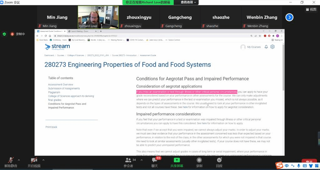 -新西兰梅西大学食品科学与工程专业中外合作办学本科教育项目的外教课程正式开课。本次外教课程通过Zoom会议方式进行。