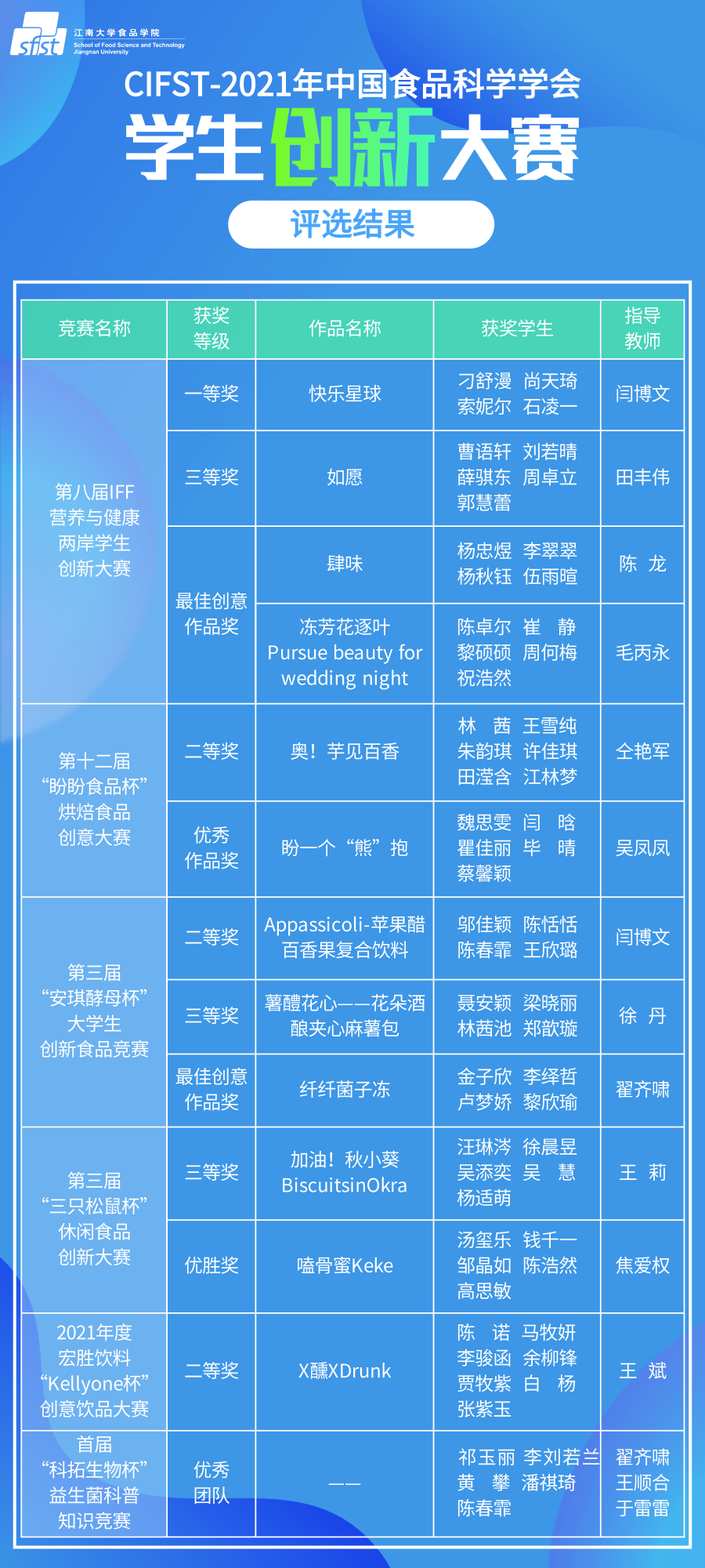 会上还揭晓了2021年中国食品科学技术学会学生创新大赛评选结果。我校食品学子在160余所高校、1300余支参赛队伍中脱颖而出,获第八届IFF营养与健康两岸学生创新大赛一等奖1项、三等奖1项、最佳创意作品奖2项;第十二届“盼盼食品杯”烘焙食品创意大赛二等奖1项、优秀作品奖1项;第三届“安琪酵母杯”大学生创新食品竞赛二等奖1项、三等奖1项、最佳创意作品奖1项;第三届“三只松鼠杯”休闲食品创新大赛三等奖1项、优胜奖1项;2021年度宏胜饮料“Kellyone杯”创意饮品大赛二等奖1项;首届科拓生物杯益生菌科普知识竞赛优秀团队奖1项。学院获第三届三只松鼠杯休闲食品创新大赛优秀组织单位奖。
