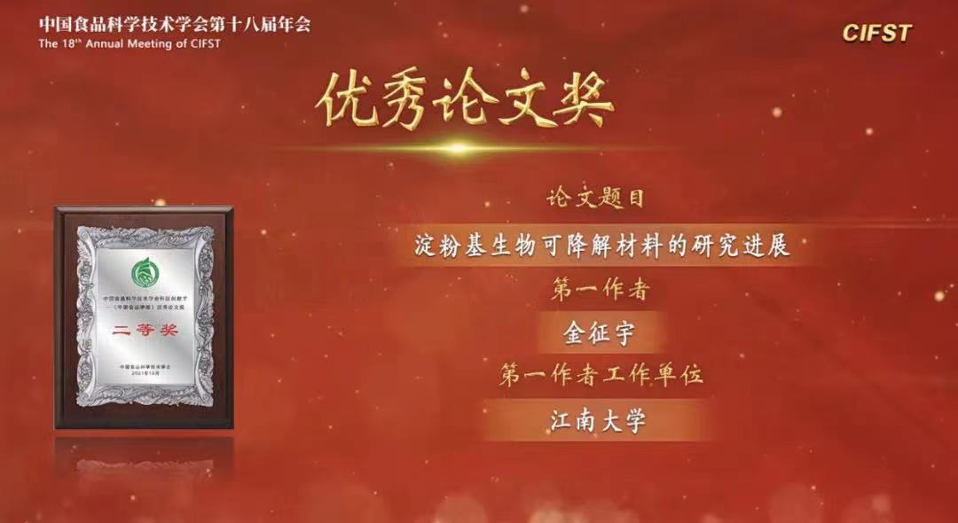 金征宇教授作为第一作者的论文《淀粉基生物可降解材料的研究进展》获“优秀论文奖”二等奖。