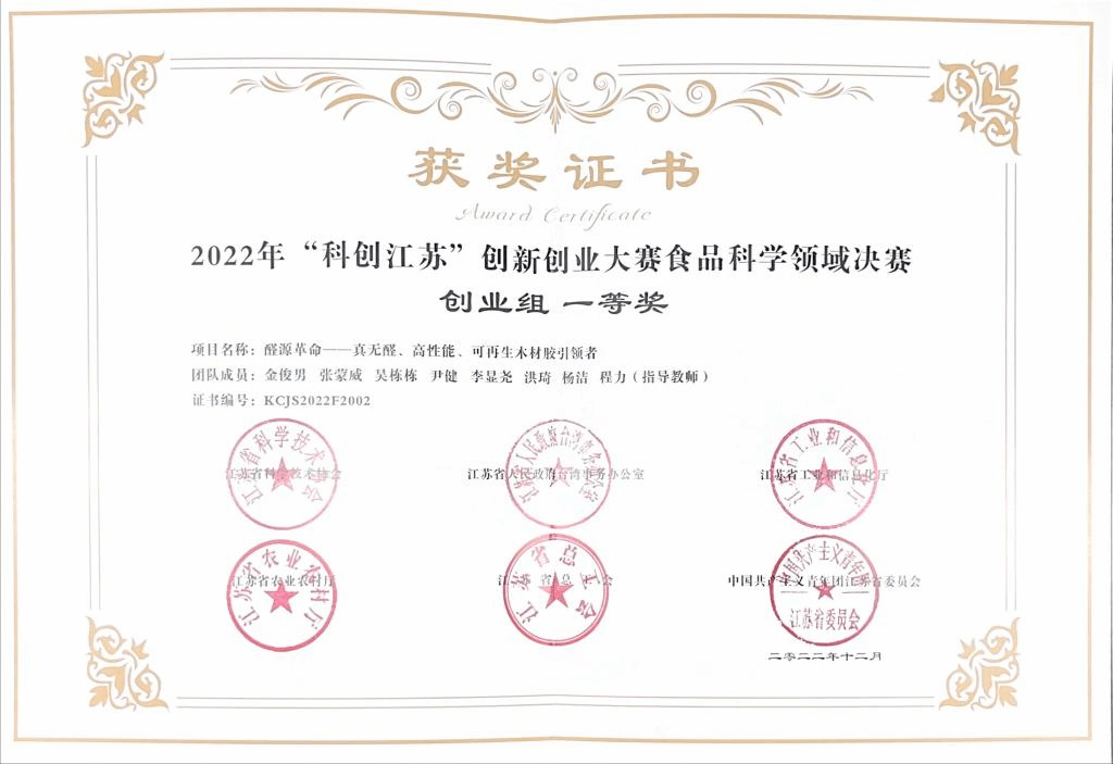 参赛项目通过层层选拔,从众多项目中脱颖而出,在团队辛勤的付出和程力老师的指导下,“醛源革命——真无醛、高性能、可再生木材胶引领者”项目荣获食品科学创业组一等奖。