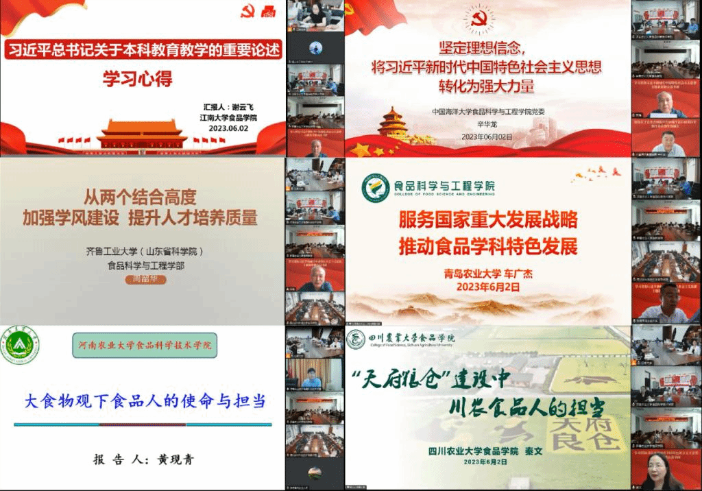 副院长、教授、博导,教育部国家级高层次青年人才谢云飞以《习近平关于本科教育教学的重要论述》作专题报告。报告围绕重要论述的时代背景、战略意义、思想精髓和重要内容,阐述了党和国家对教育的战略定位,指明了本科教育教学建设方向。中国海洋大学食品科学与工程学院党委书记、教授,《形势与政策课》主讲人辛华龙以《坚定理想信念,将习近平新时代中国特色社会主义思想转化为强大力量》作专题报告。报告结合主题教育和党的二十大对理想信念教育的有关要求,阐述了教育工作者坚定理想信念的重要意义。齐鲁工业大学(山东省科学院)食品科学与工程学部党委书记、副教授周邵华以《从“两个结合”高度加强学风建设提升人才培养质量》作专题报告。报告结合高校人才培养过程中存在的普遍问题,从马克思主义实践性、人民性双重维度分析了“两个结合”的内在逻辑,并强调了要抓好学风建设的重要性。青岛农业大学食品科学与工程学院党委书记、副教授,特种食品研究院副院长车广杰以《服务国家重大发展战略,推动食品学科特色发展》作专题报告。报告分享了学院在联合多元主体开展食品领域协同创新,推动学校食品学科特色发展的生动实践。河南农业大学食品科学技术学院院长、教授、博导,河南省优秀教师黄现青以《大食物观下食品人的使命与担当》作专题报告。报告围绕习近平总书记关于大食物观的重要论述,深刻阐释了“大食物观”的核心要义,指出了食品人要以德为先,强化使命担当。四川农业大学色情网站