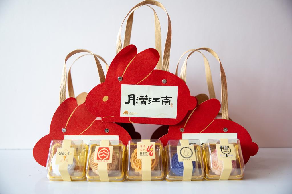 五大俱乐部指导下,由中外师生亲手制作了清香五仁、咸香肉松、冰激凌莲蓉、巧克力留心和芋泥奶酪五种口味的月饼。红色玉兔作为礼盒主体,彰显中秋节日主题,“月满江南",寄托了对每一位江南师生最真挚的节日祝福!