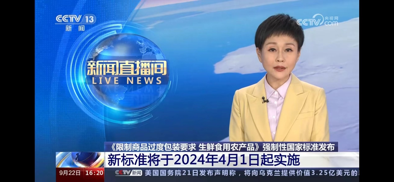 直播间、中国经济网、新华社、中国之声等各大平台报道。该标准将于2024年4月1日起正式实施,并为强化商品过度包装全链条治理、引导生鲜食用农产品生产经营企业适度合理包装、规范市场监管提供执法依据和基础支撑。