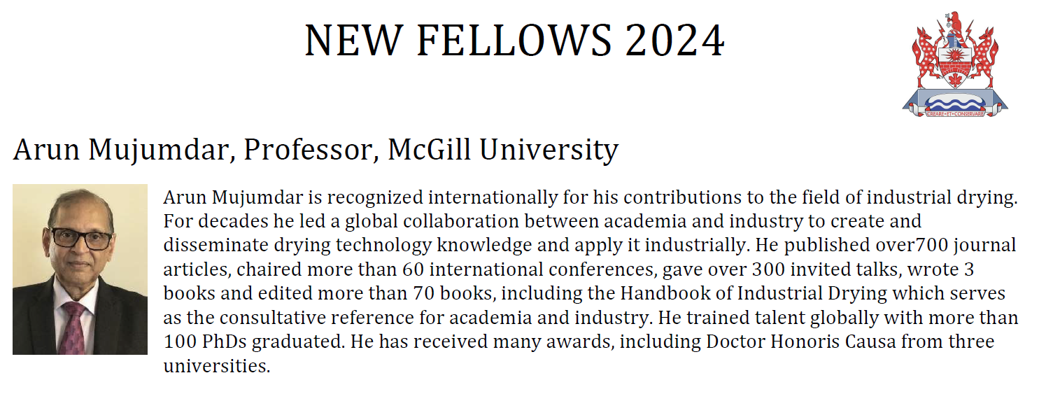 2024年5月6日,加拿大工程院(Canadian Academy of Engineering,CAE)院长Soheil Asgarpour宣布54名新增院士名单,我校荣誉教授、加拿大麦吉尔大学(McGill University)教授艾伦·牟俊达(Arun S. Mujumdar)成功当选。