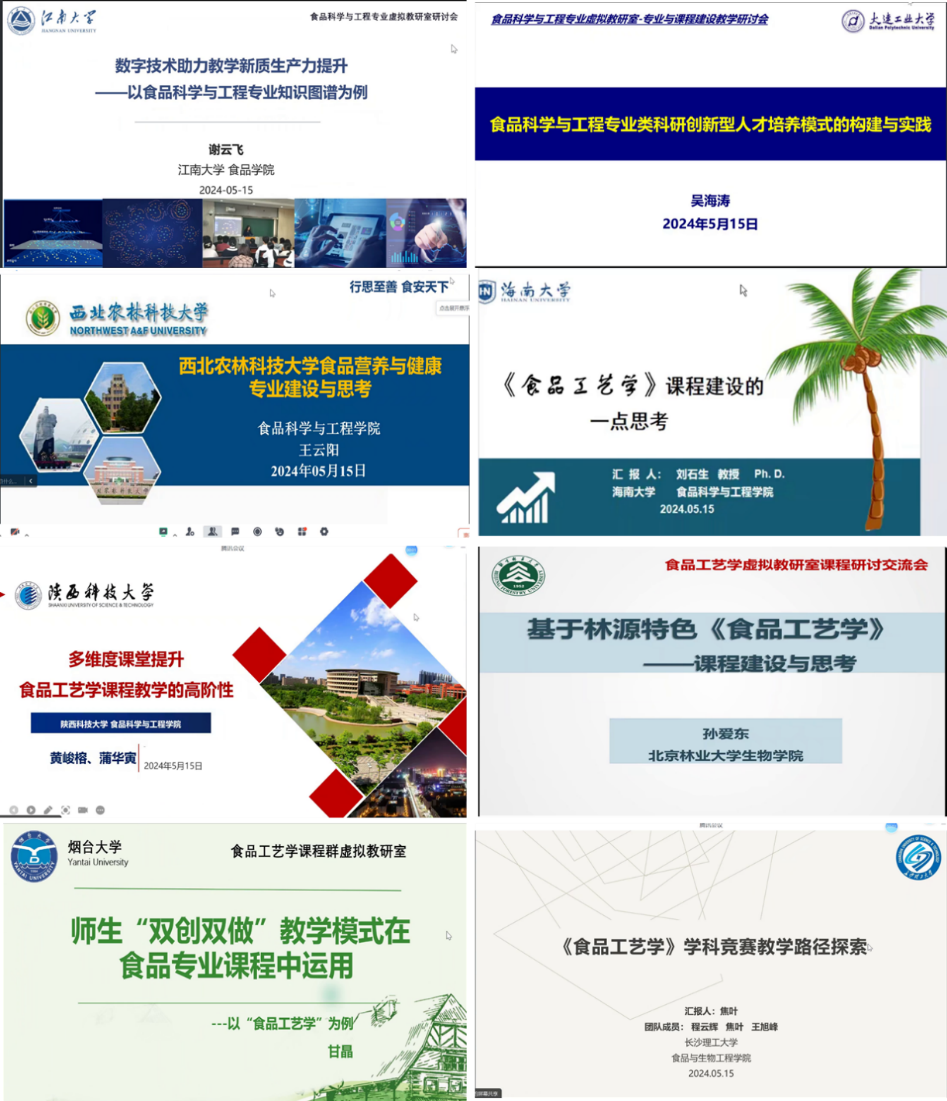 谢云飞副院长、西北农林科技大学王云阳副院长和大连工业大学吴海涛副院长分别做了题为“数字技术助力教学新质生产力提升-以食品科学与工程专业知识图谱为例”、“西北农林科技大学食品营养与健康专业建设与思考”和“食品科学与工程类专业科研创新型人才培养模式的构建与实践”的分享报告。随后,北京林业大学孙爱东教授、陕西科技大学蒲华寅教授、海南大学刘石生教授、石河子大学程少波副教授、东北林业大学李德海副教授、烟台大学甘晶副教授、长沙理工大学焦叶副教授围绕食品工艺学课程建设分别做了题为“基于林源特色《食品工艺学》课程建设与思考”、“多维度课堂提升食品工艺学课程教学的高阶性”、“《食品工艺学》课程建设的一点思考”、“专业认证背景下“食品工艺学”课程的建设与探索“、“《植物产品加工工艺学》实验课程改革与探索”、“师生“双创双做”教学模式在食品专业课程中的应用-以食品工艺学为例”、“《食品工艺学》学科竞赛教学路径探索”7场主题报告。此次研讨会持续三个多小时,引起了与会专家和老师的热烈反响,他们表示,通过本次研讨会,开阔了眼界、拓展了思路,学习到很多宝贵的专业建设和课程建设的经验和方法,对于提升食品专业的教学质量将起到极大的帮助作用。