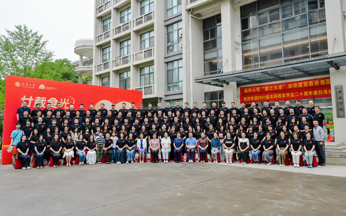 大家齐聚在学院楼前广场,镜头中绽放着一张张欢快的笑颜——身后的食品大楼庄严伫立,绿树浓荫摇曳生姿,共同见证着廿载春秋的深厚情谊,将这一温情时刻永久定格为青春纪念册里的璀璨一页。