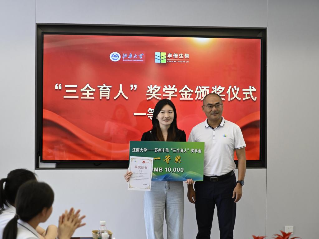 平原、李雷等为荣获第二届苏州丰倍“三全育人”奖学金的本硕博学生代表颁发荣誉证书,并合影留念。李雷向苏州丰倍颁授“色情网站