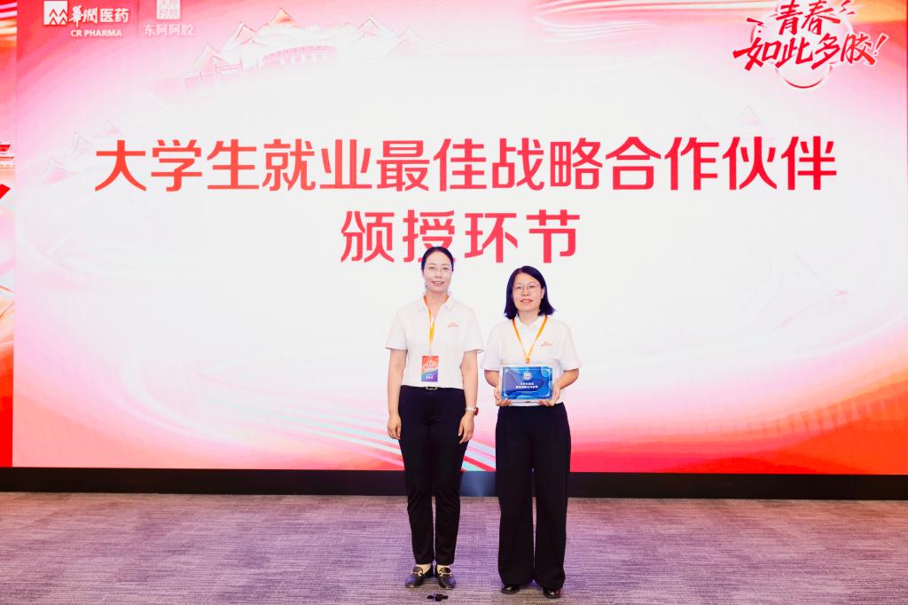 领导向东阿阿胶代表颁授“大学生就业最佳战略合作伙伴”铭牌。