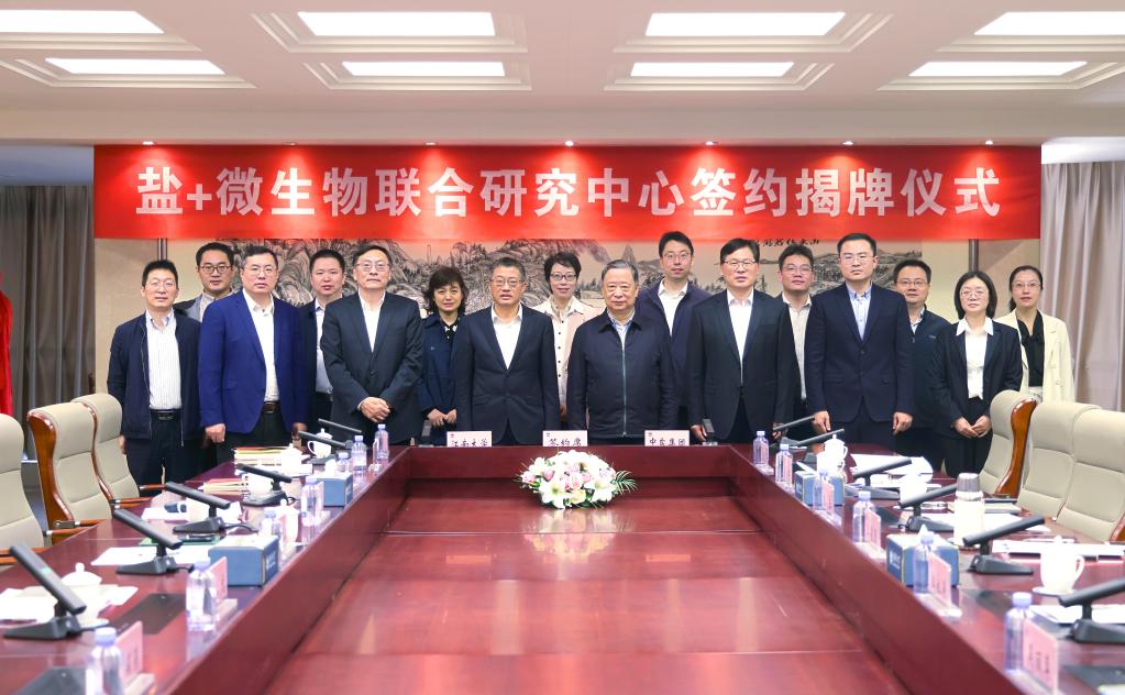 在与会嘉宾的共同见证下,中盐金坛公司总经理钮永涛与我校食品科学与资源挖掘全国重点实验室常务副主任翟齐啸教授代表双方签署合作协议,李耀强与陈卫共同为“盐+微生物联合研究中心”揭牌。