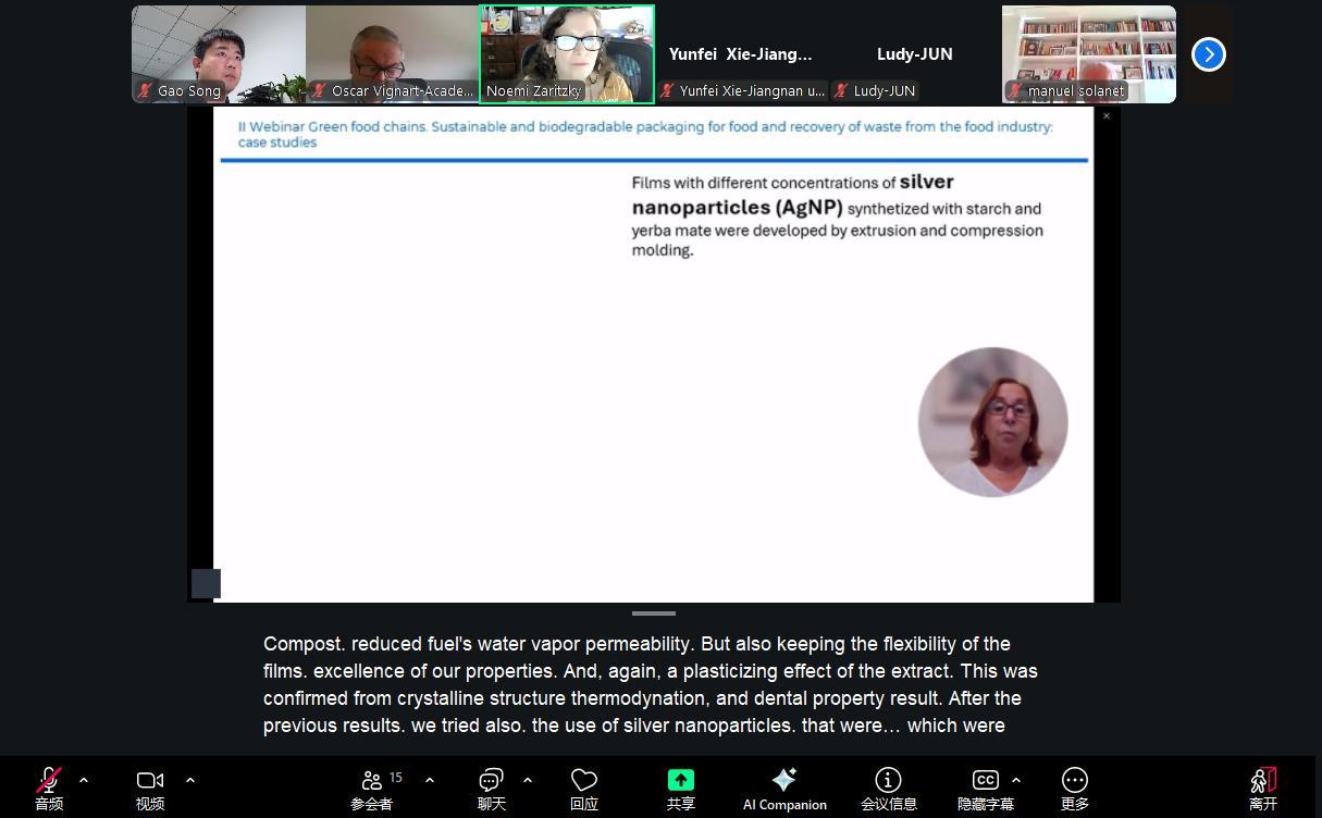 近日,中国工程院(CAE)与阿根廷工程院(ANI)共同举办主题为“绿色食物链:食品用可持续可生物降解包装及食品工业废弃物回收利用—案例研究”的第二期联合线上研讨会。本次会议聚焦可持续包装、废弃物增值利用等前沿议题,共同探索食品产业绿色转型路径。会议由食品科学与技术研究与发展中心(CIDCA)主任Noemí Zaritzky教授主持。
