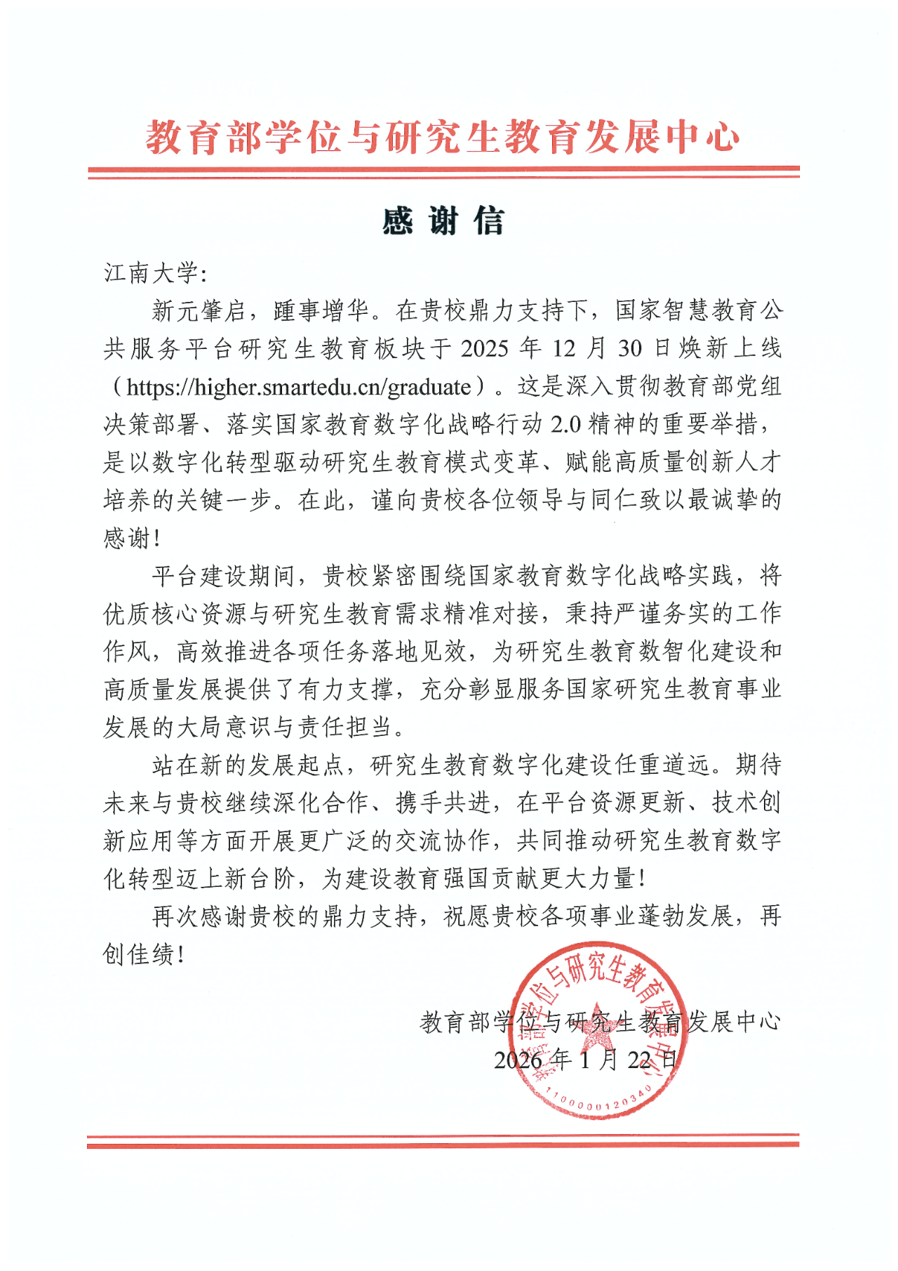 近日,教育部学位与研究生教育发展中心向我校发来感谢信,高度肯定学校牵头研发的FoodSeek(食问)大模型,对我校在国家智慧教育公共服务平台研究生教育板块建设过程中给予的大力支持表示诚挚感谢,并期待未来与我校继续深化合作,共同推动研究生教育数字化转型迈上新台阶。