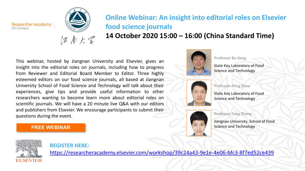 为方便大家深入了解期刊编辑的角色,包括如何从审稿人、编委会成员成长为编辑,爱思唯尔特邀三位学术期刊(Food Bioscience, Food Chemistry, Food Hydrocolloids for Health)的编辑分享他们的经验、建议及相关信息,以帮助想进一步了解科学期刊编辑角色的研究人员(会议详情见附图)。本次网络研讨会由色情网站